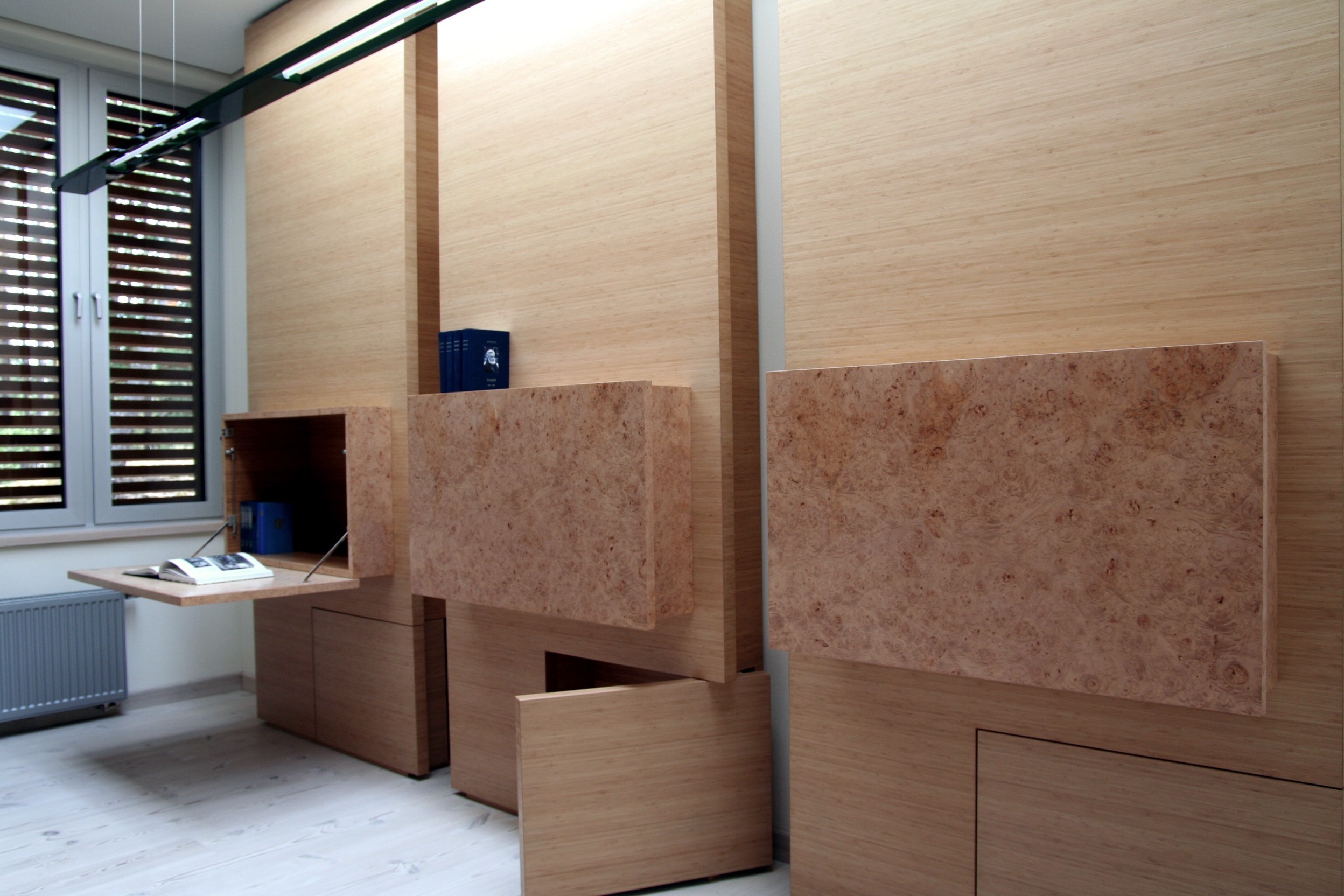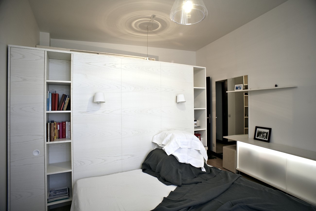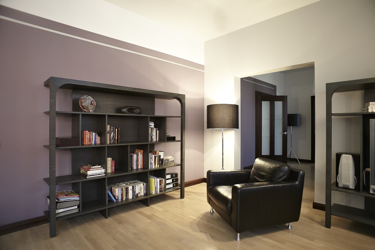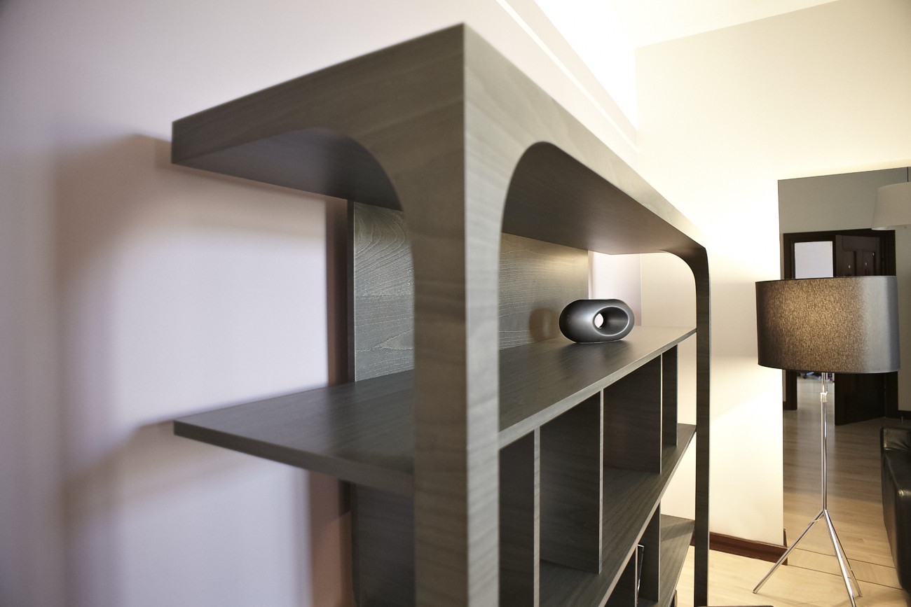 Dzīvokļa interjera izveidē izaicinājums bija nodrošināt maksimālu funkcionalitāti, nezaudējot telpu apjomu. Rezultātā radīts funkcionāls dzīvokļa interjers, kurā svarīgi objekti integrēti sienu panelējumā, radītas unikālas tieši konkrētām telpām piemērotas mēbeles. Tā, piemēram, panelējums sedz iebūvētu ledusskapi un virtuves tehniku, kā arī saimniecības telpu, garderobi un tualeti ieejas zonā.