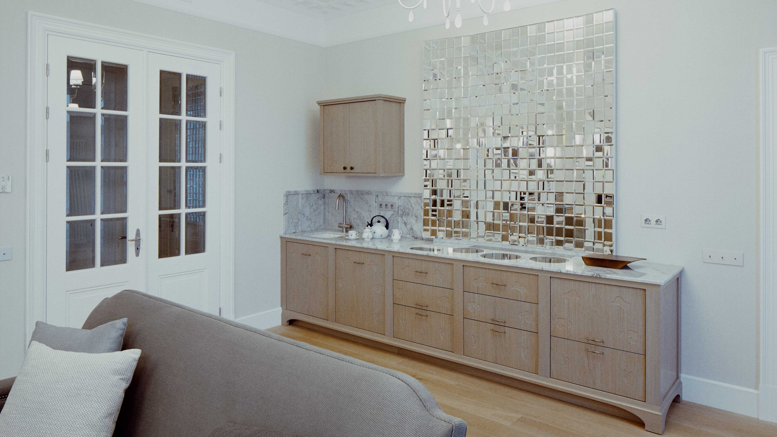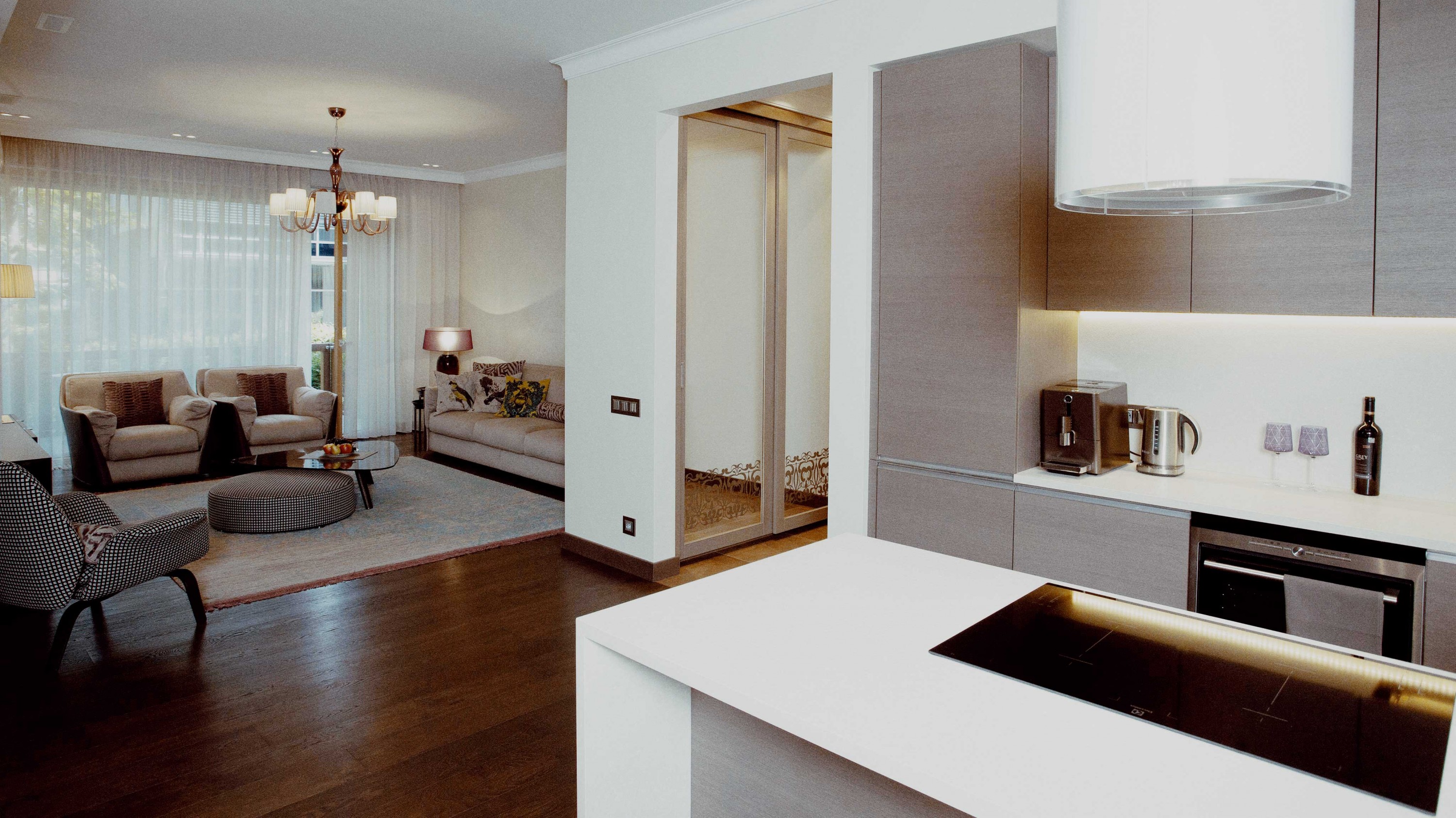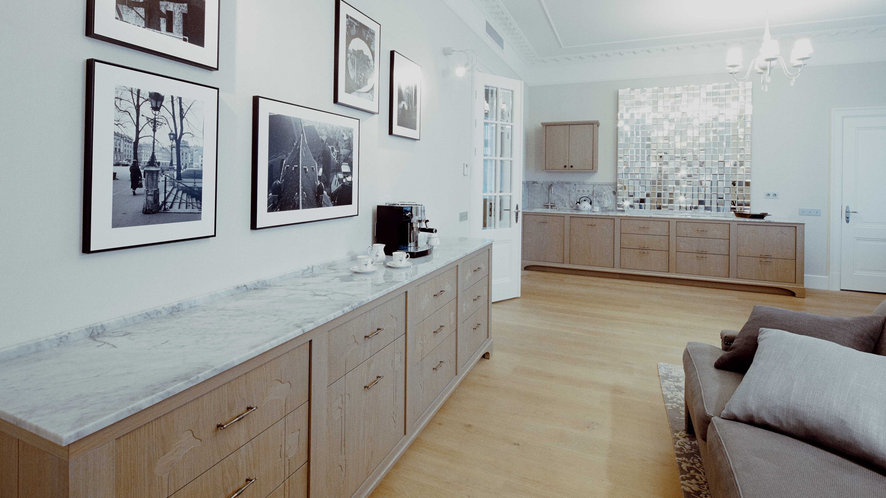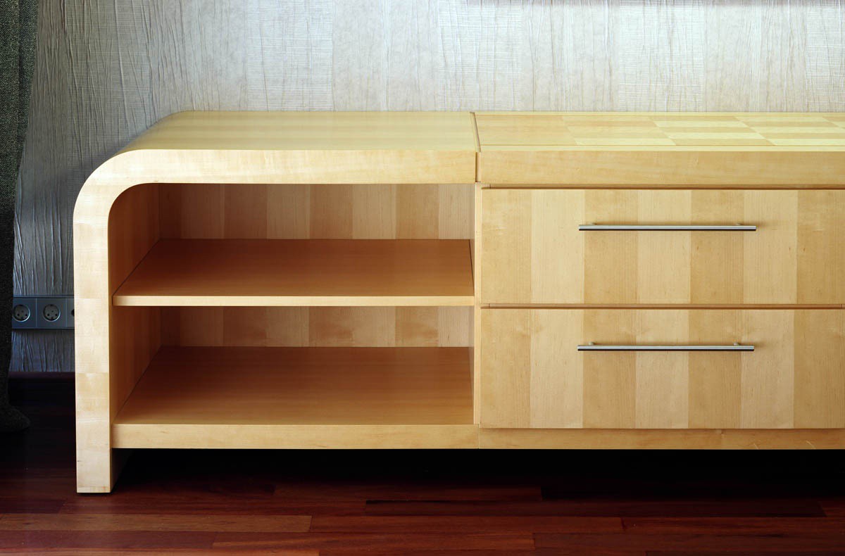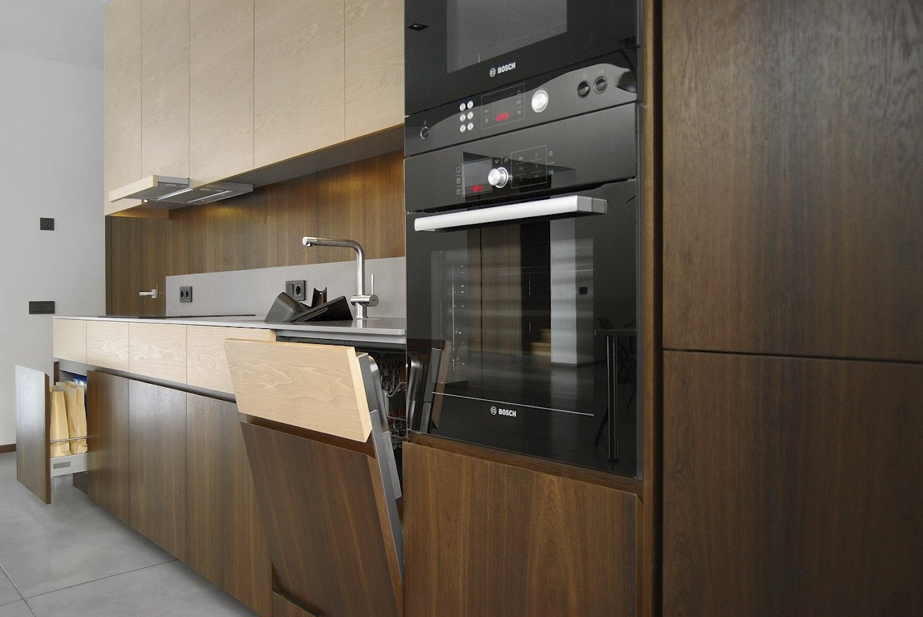 Dzīvokļa interjera izveidē izaicinājums bija nodrošināt maksimālu funkcionalitāti, nezaudējot telpu apjomu. Rezultātā radīts funkcionāls dzīvokļa interjers, kurā svarīgi objekti integrēti sienu panelējumā, radītas unikālas tieši konkrētām telpām piemērotas mēbeles. Tā, piemēram, panelējums sedz iebūvētu ledusskapi un virtuves tehniku, kā arī saimniecības telpu, garderobi un tualeti ieejas zonā.