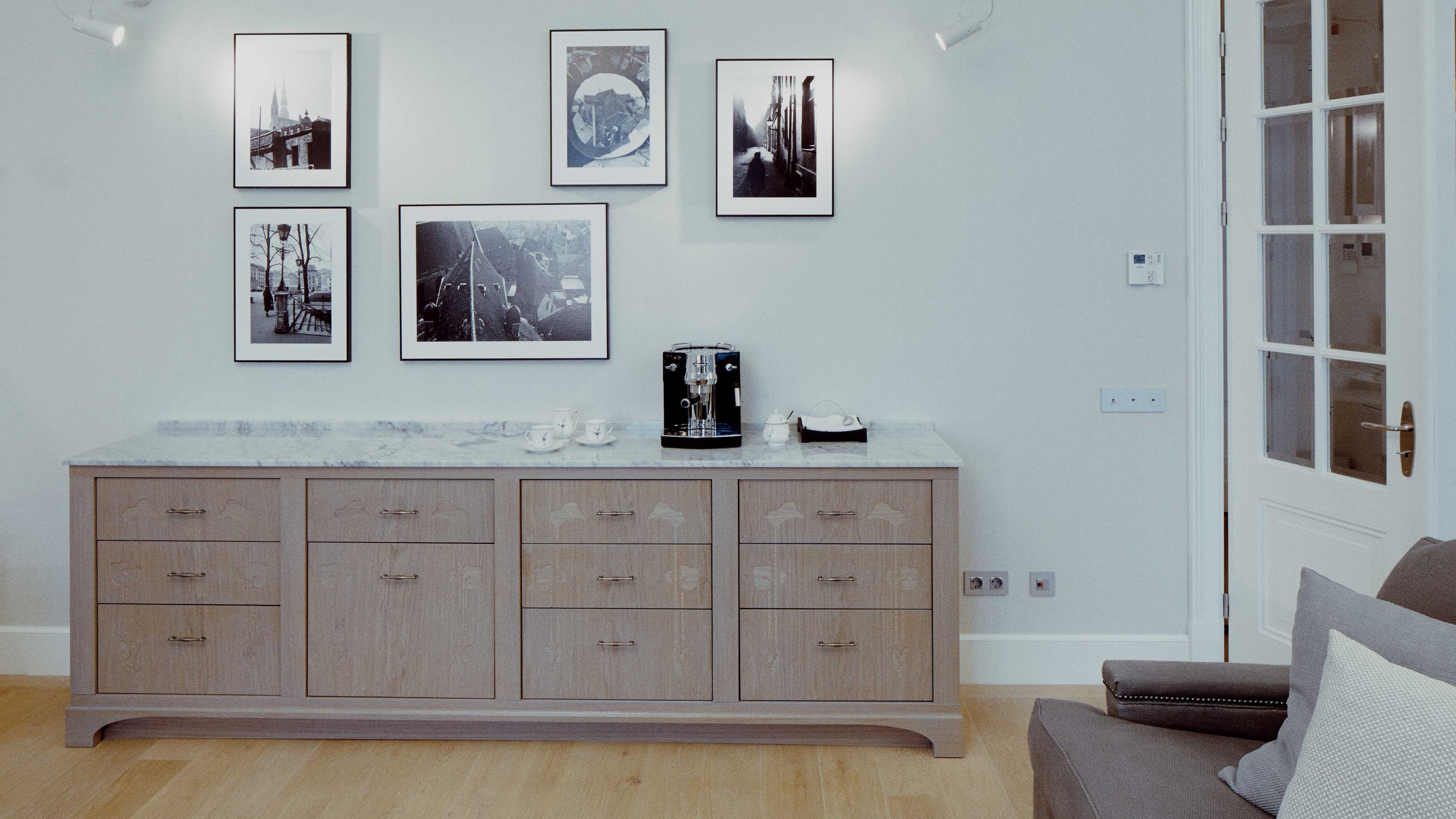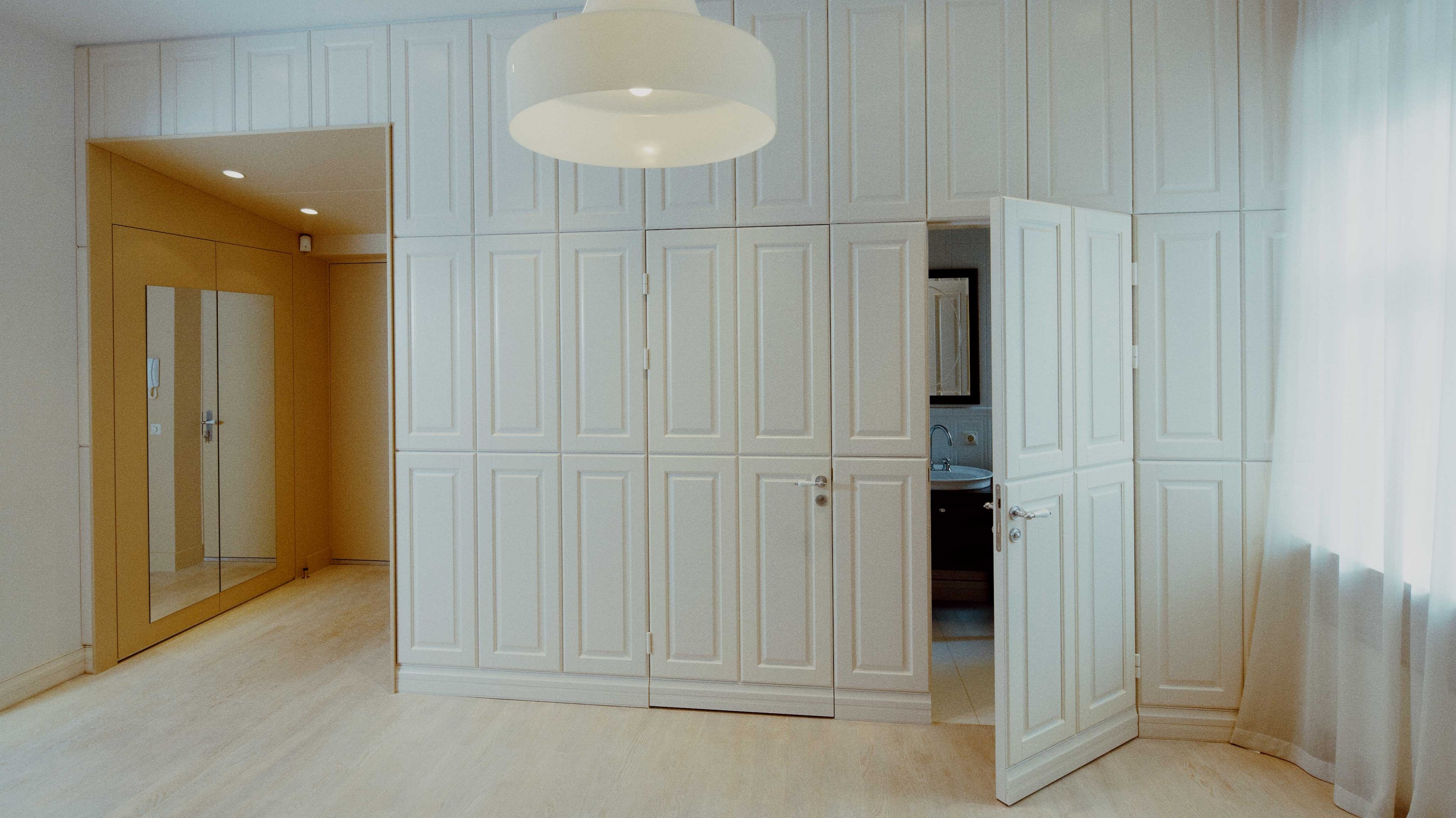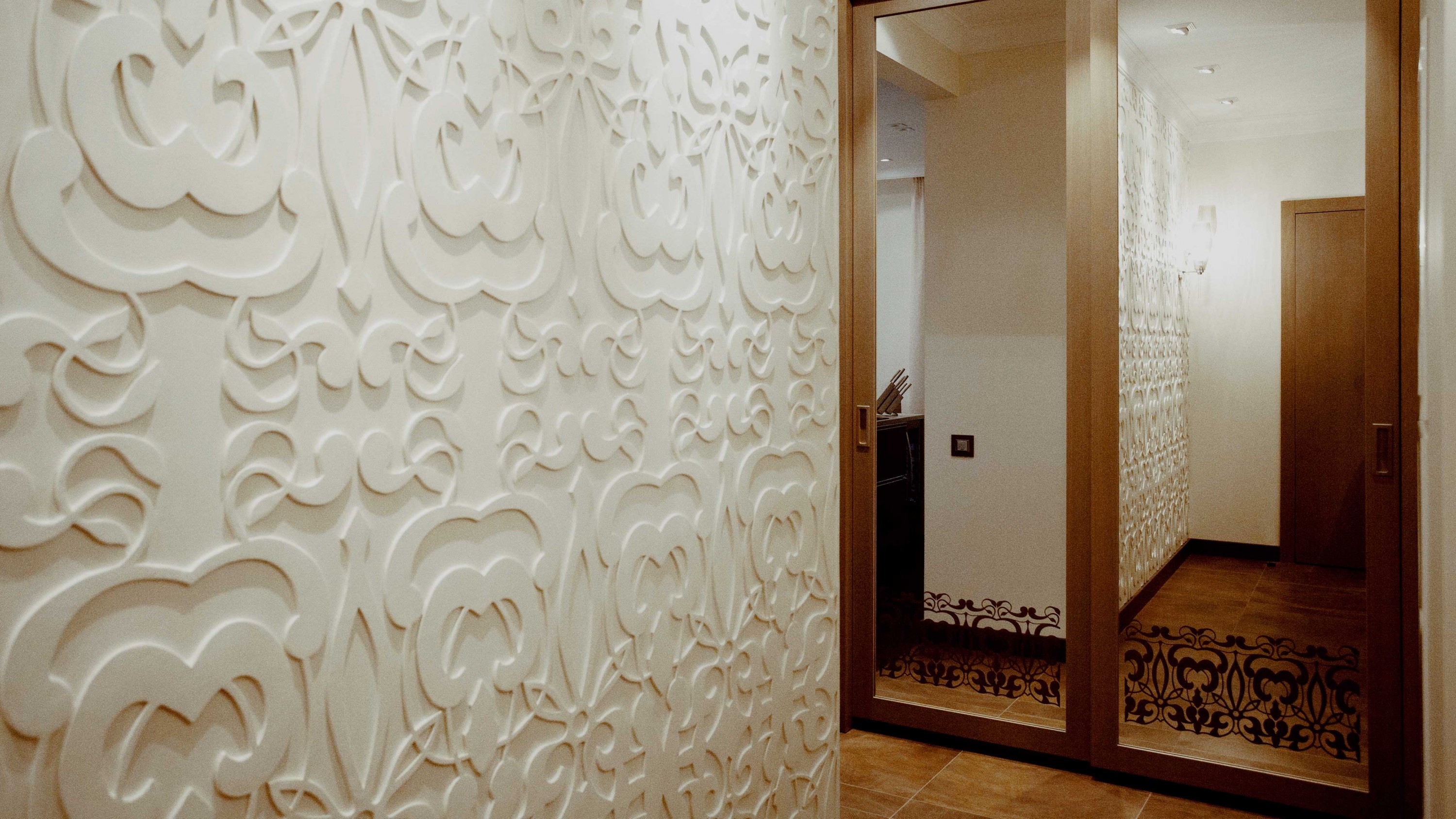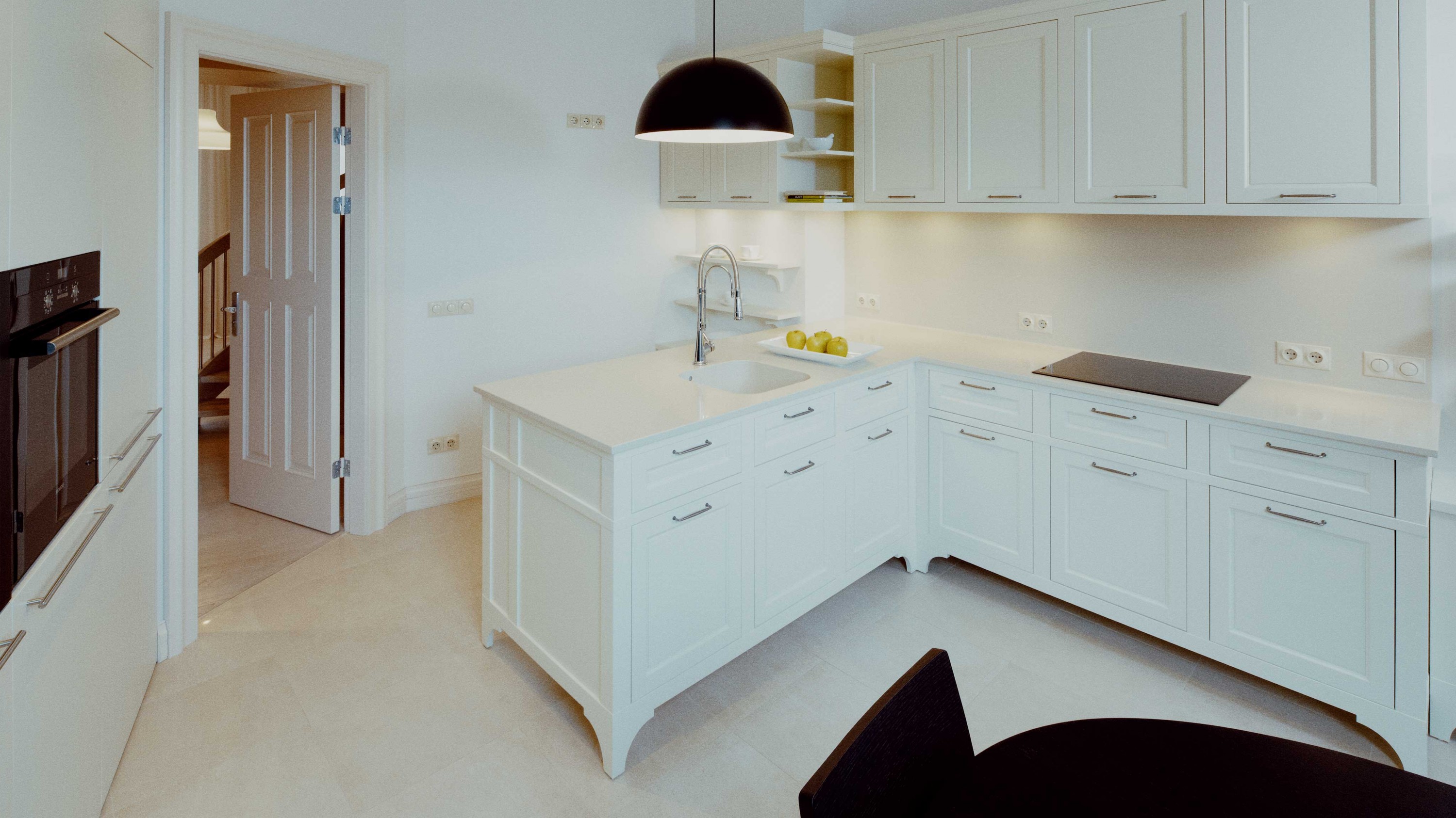 Dzīvokļa interjera izveidē izaicinājums bija nodrošināt maksimālu funkcionalitāti, nezaudējot telpu apjomu. Rezultātā radīts funkcionāls dzīvokļa interjers, kurā svarīgi objekti integrēti sienu panelējumā, radītas unikālas tieši konkrētām telpām piemērotas mēbeles. Tā, piemēram, panelējums sedz iebūvētu ledusskapi un virtuves tehniku, kā arī saimniecības telpu, garderobi un tualeti ieejas zonā.
