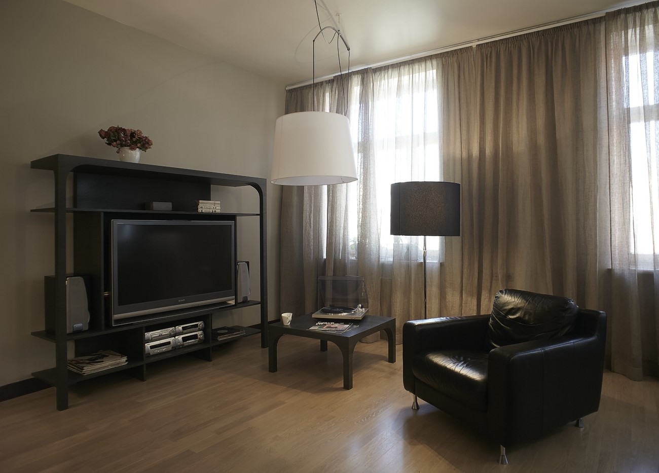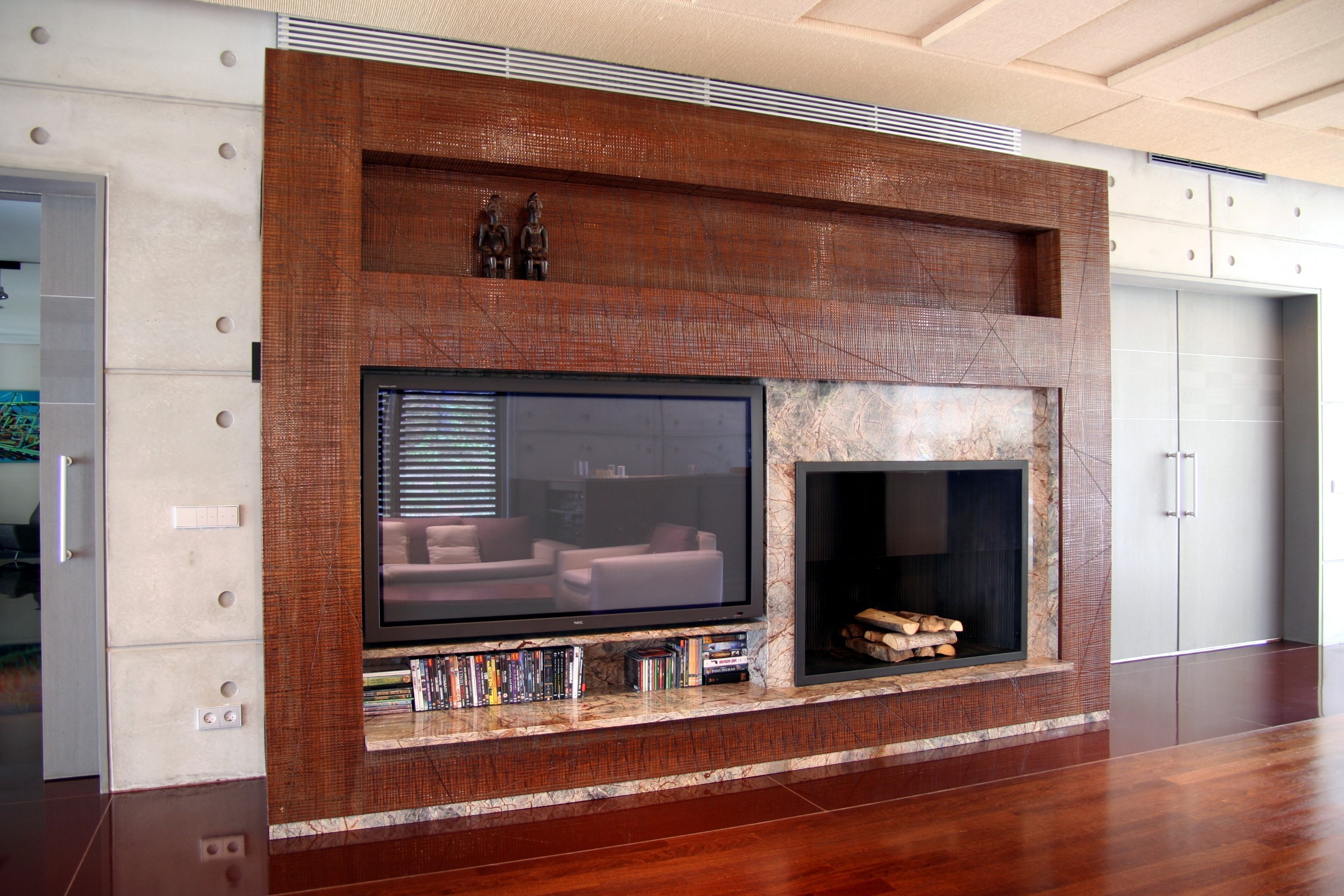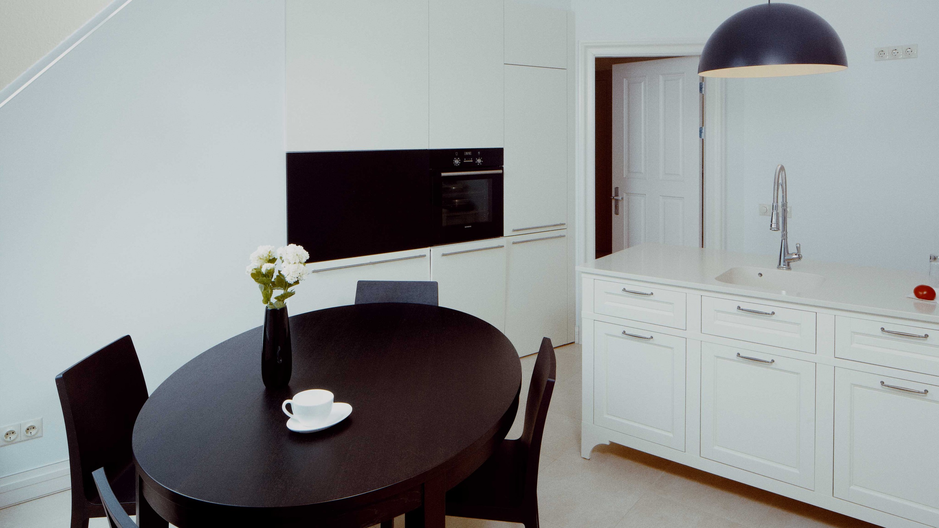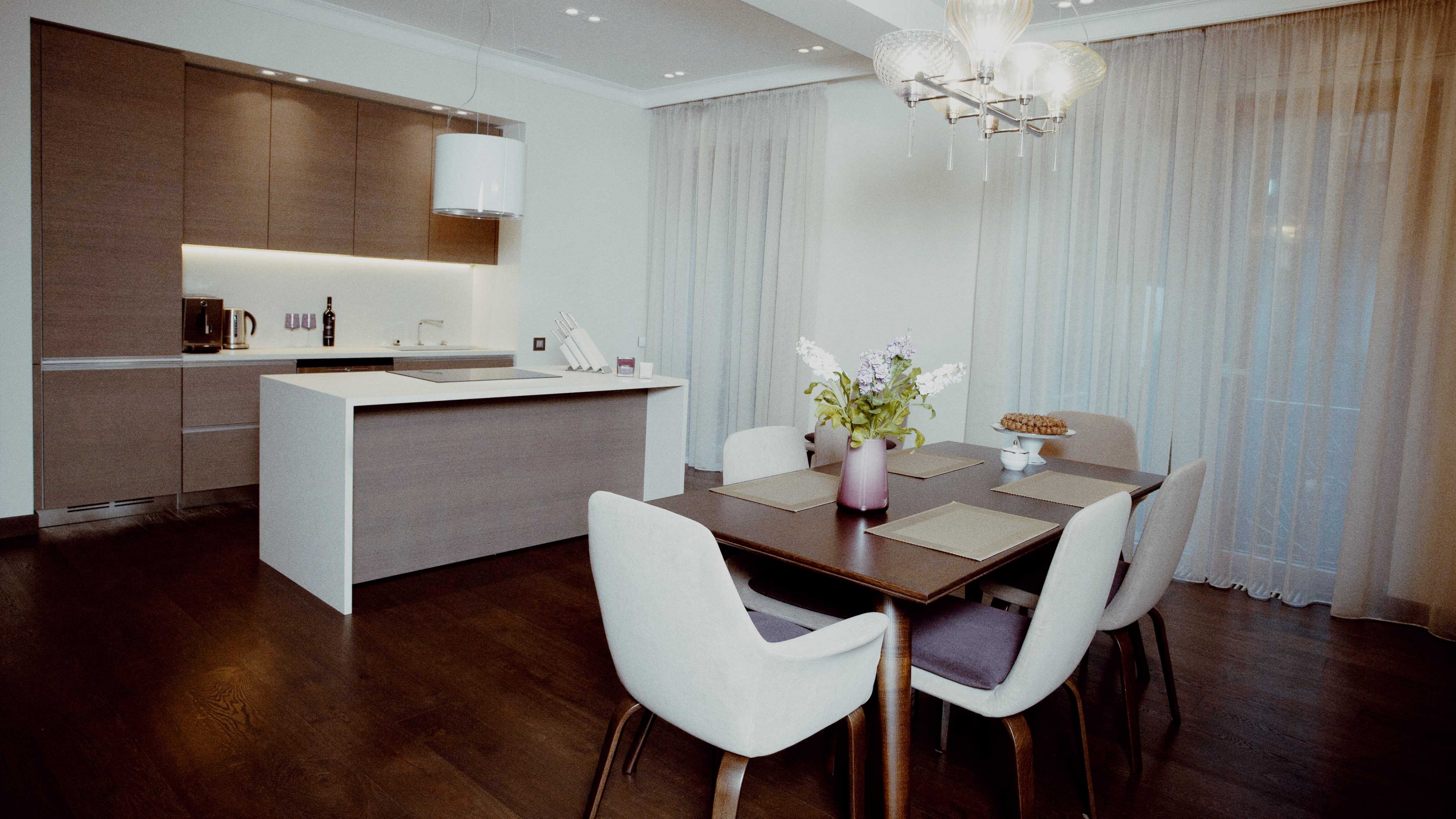 Dzīvokļa interjera izveidē izaicinājums bija nodrošināt maksimālu funkcionalitāti, nezaudējot telpu apjomu. Rezultātā radīts funkcionāls dzīvokļa interjers, kurā svarīgi objekti integrēti sienu panelējumā, radītas unikālas tieši konkrētām telpām piemērotas mēbeles. Tā, piemēram, panelējums sedz iebūvētu ledusskapi un virtuves tehniku, kā arī saimniecības telpu, garderobi un tualeti ieejas zonā.