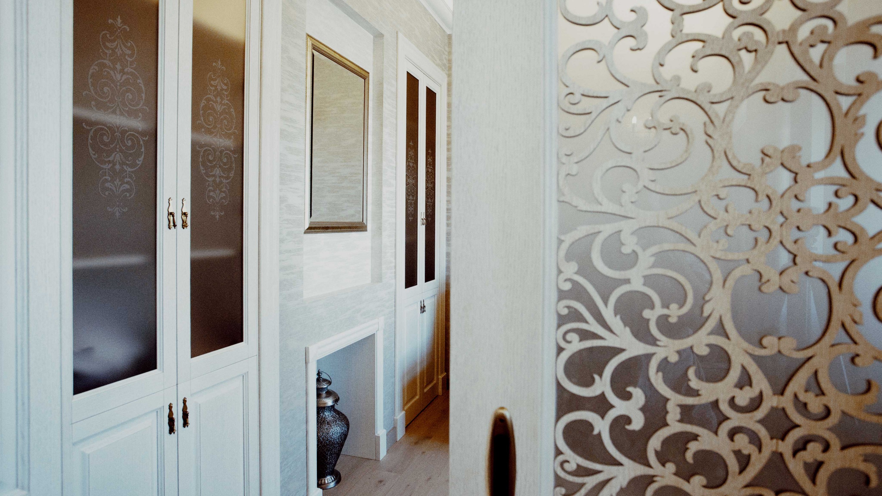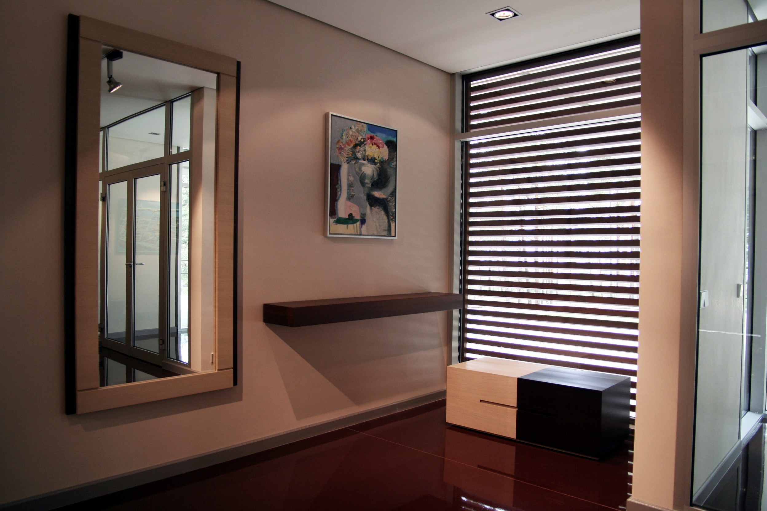 Atbilstoši īpašnieka gaumei interjera pamatā liktas klasiskas līnijas un risinājumi, vienlaikus piešķirot katrai telpai modernu funkcionalitāti un mūsdienīgas ērtības. Izmantotie materiāli ir eļļots ozols, krāsots MDF.
